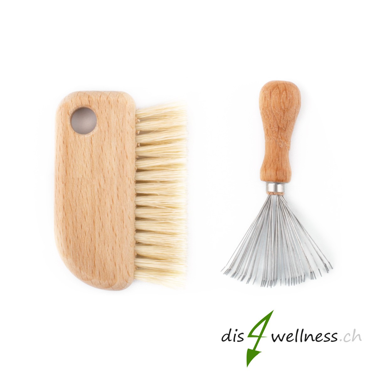 Praktisches Set zum Reinigen und Pflegen von Haarbürsten. Mit dem Kamm- und Bürstenreiniger aus Draht können Haare aus Haarbürsten und Kämmen entfernt werden. Der Haarbürstenreiniger aus Buchenholz und heller Borste eignet sich zum Reinigen und Waschen der Haarbürste